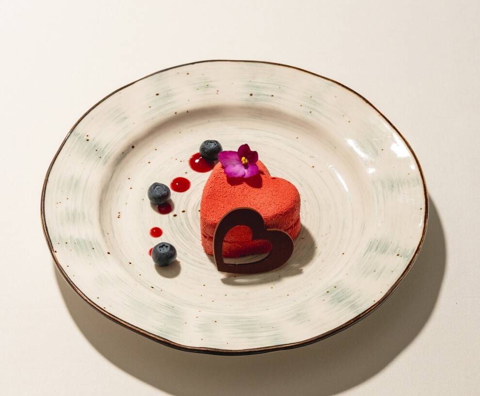 Мусс из перетертой вишни со сливками и желатином с сердцем из пюре из манго, покрытый шоколадным велюром. Подается с ягодным соусом и ягодами голубики