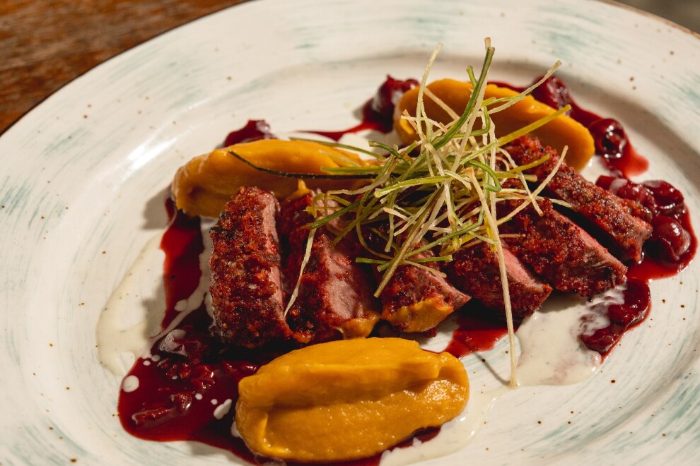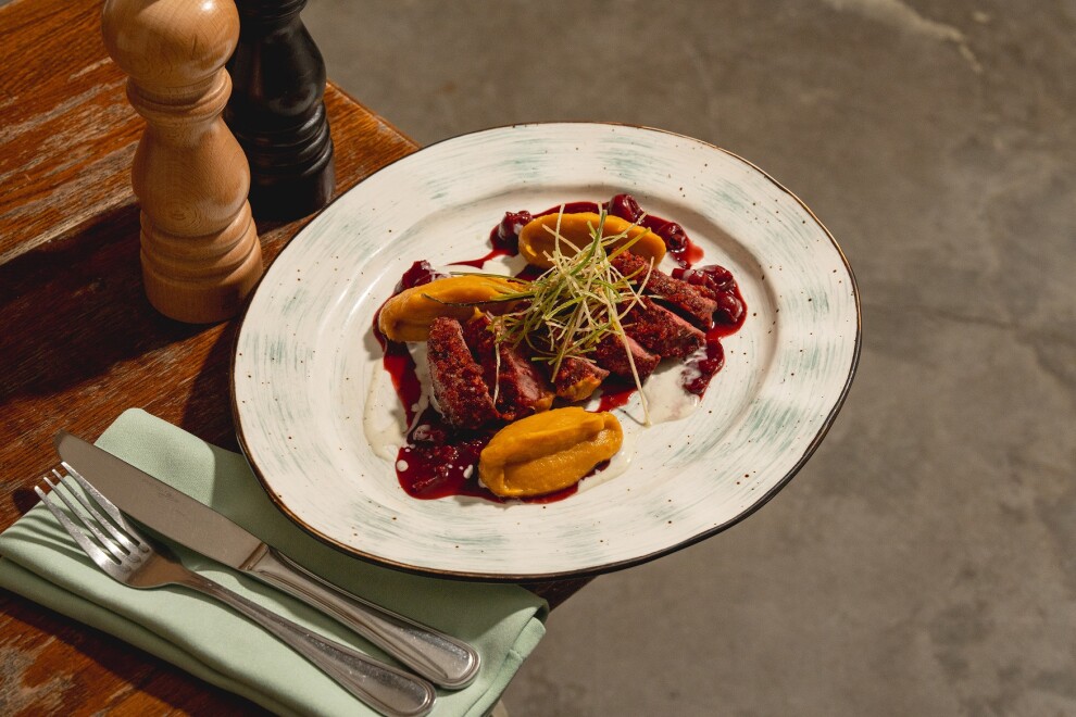 ВЫРЕЗКА ЯГНЕНКА В СУХАРЯХ С ПЮРЕ ИЗ БАТАТА И СОУСАМИ РОКФОРТИ И ВИШНЕВО-ВИННЫМ