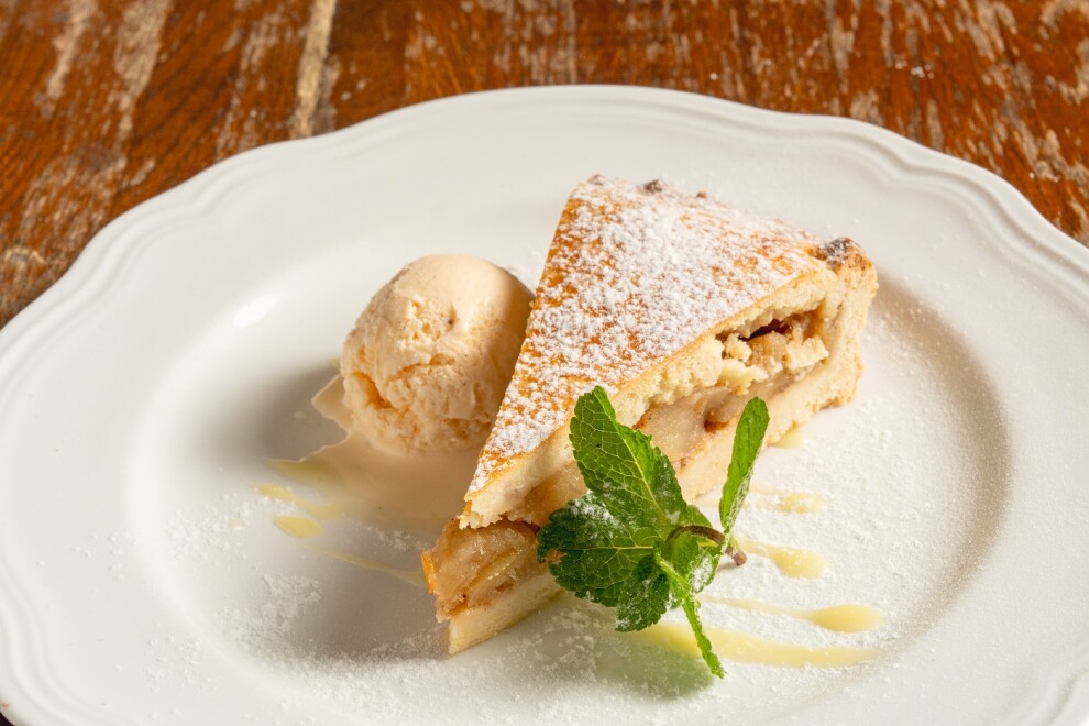 Пирог из песочного теста с начинкой из яблок. Подается с заварным ванильным соусом из сливок, молока, яйца и ванили, и с шариком ванильно мороженого