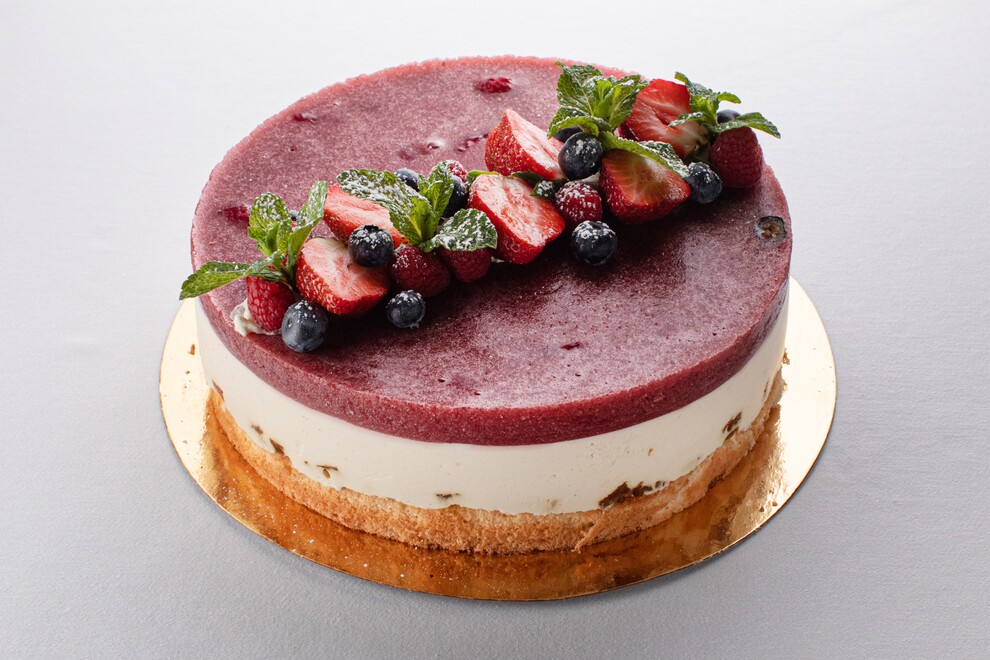 Сливочно-йогуртовый мусс с белым шоколадом, бисквитной основой и фруктами